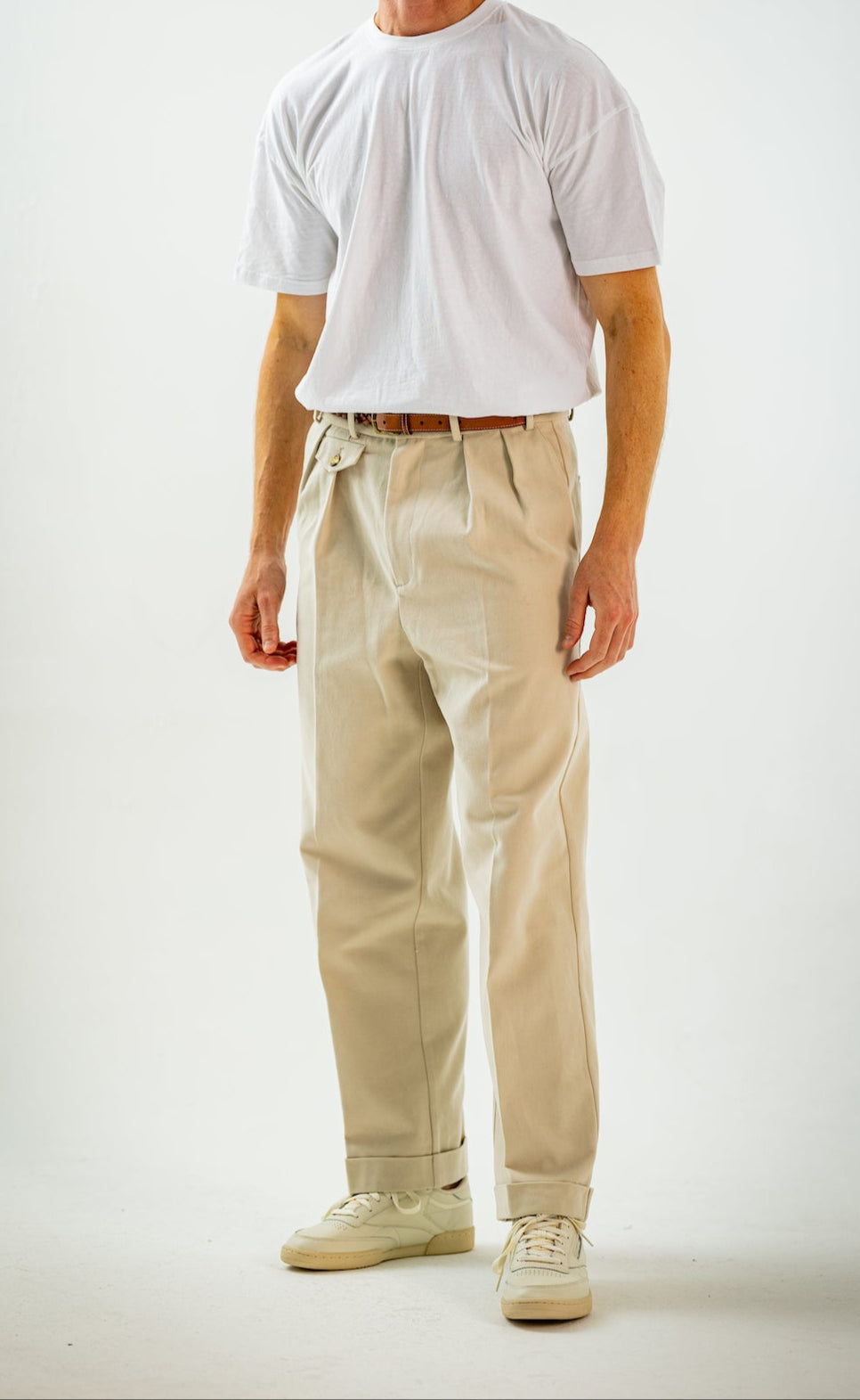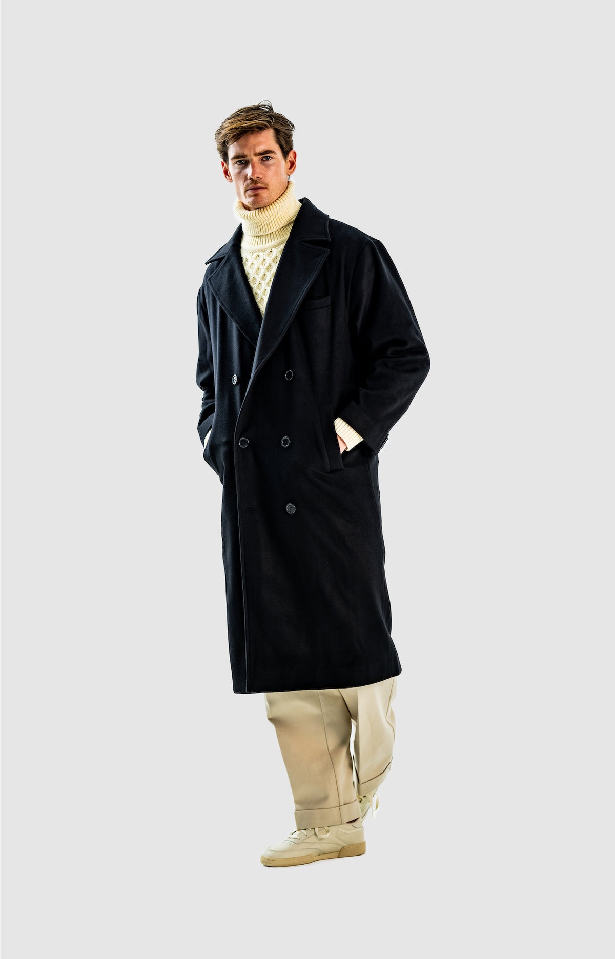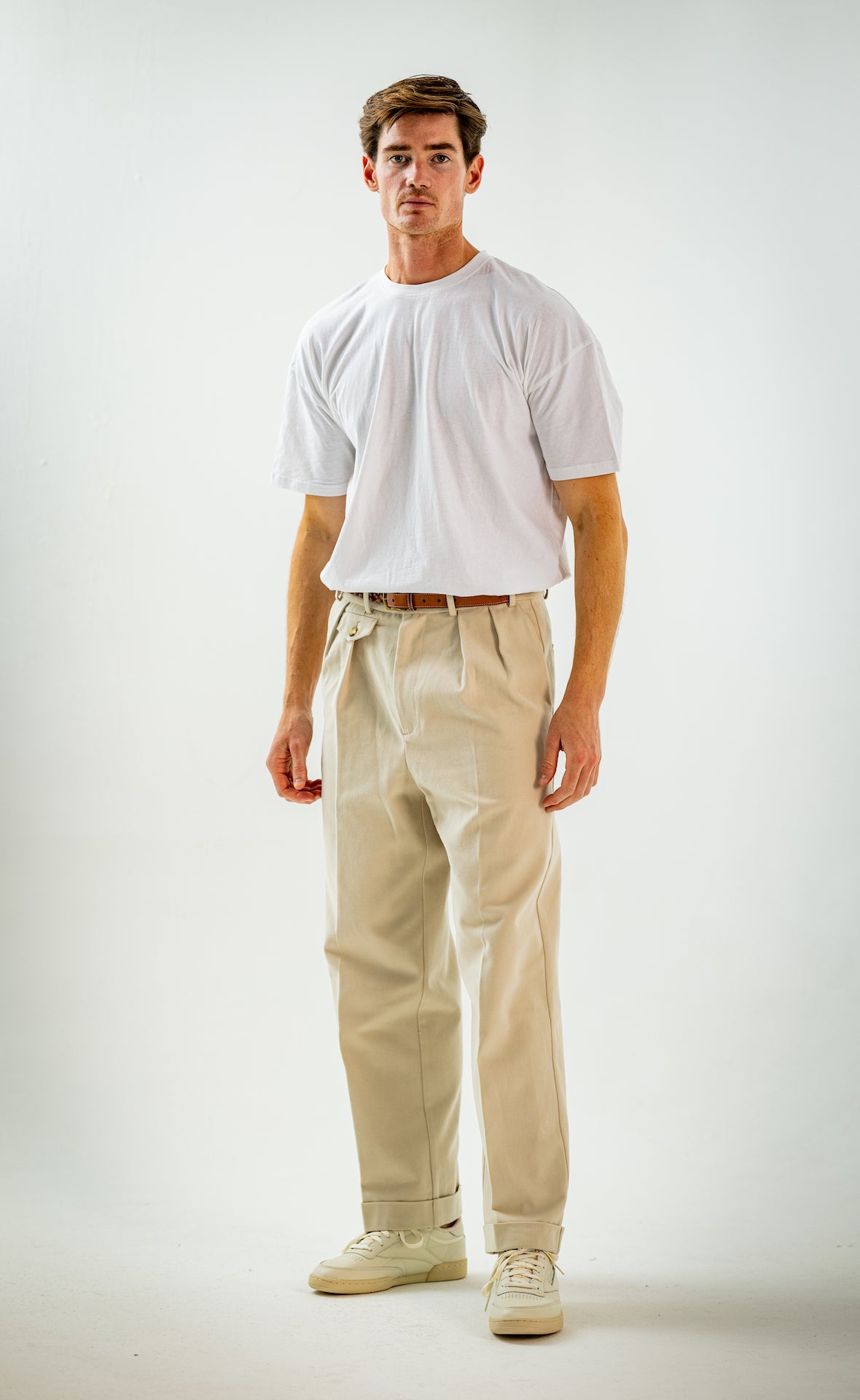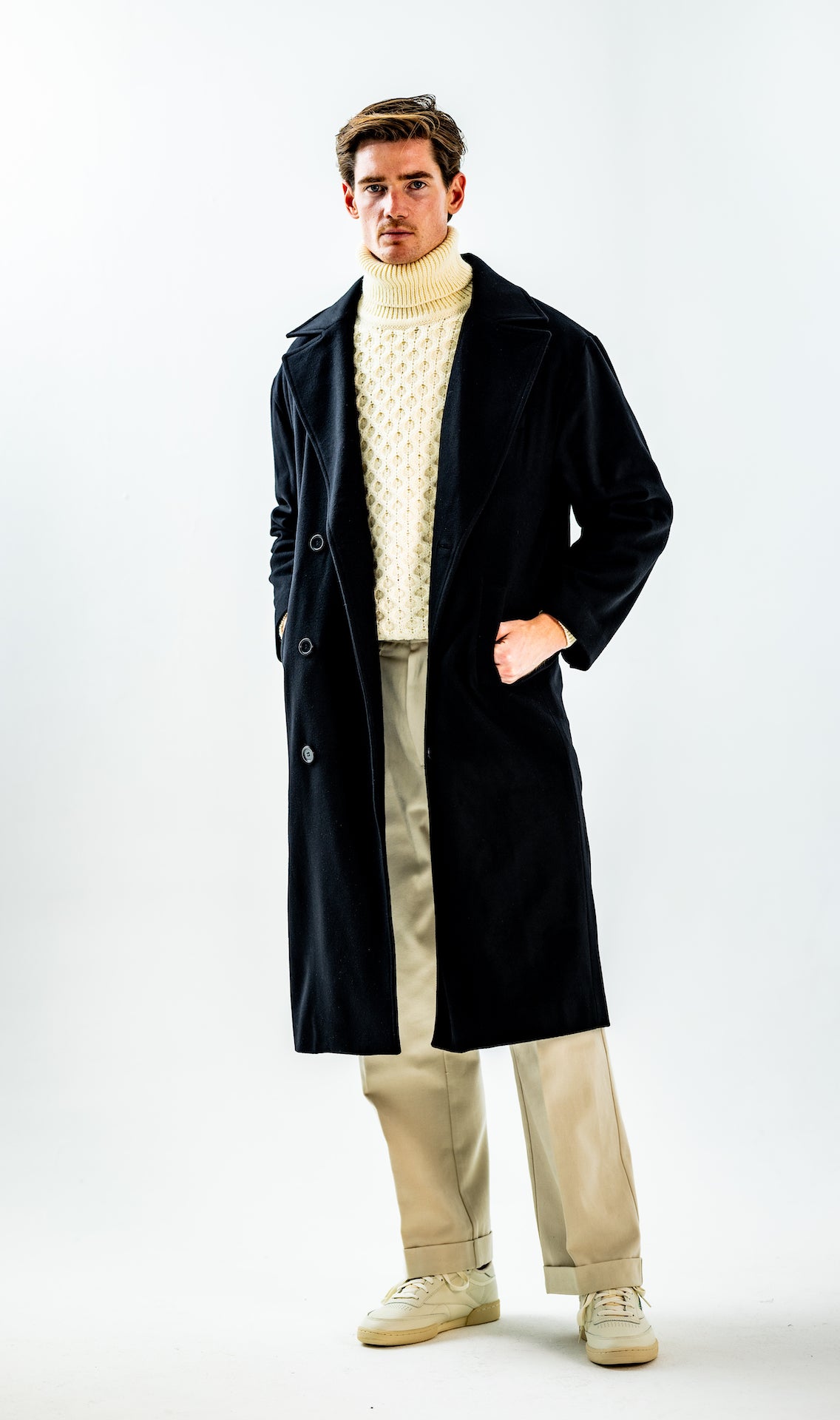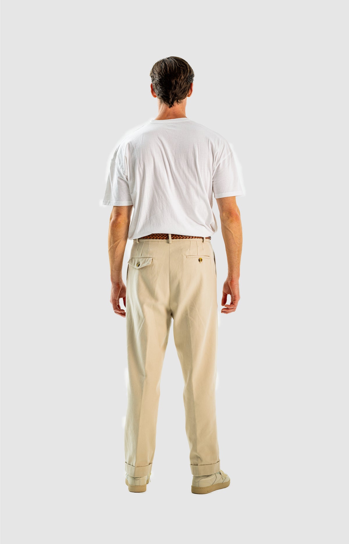 Wide and straight-legged pants only! Men have to start wearing trousers again and wear them on their waist again, and not on the hips or lower. This jacket is a fit meant to sit on your hips, just on or over your trousers' waist. A good leather and/or simple belt really helps frame the outfit and division between top and bottom. I highly recommend a pair of straight light blue or navy jeans, straight or wide chinos in cream, navy or even black, and of course, our own pleated trousers too. Either cropped or full-length trousers work here.