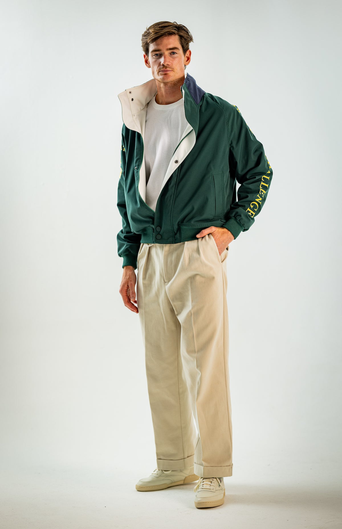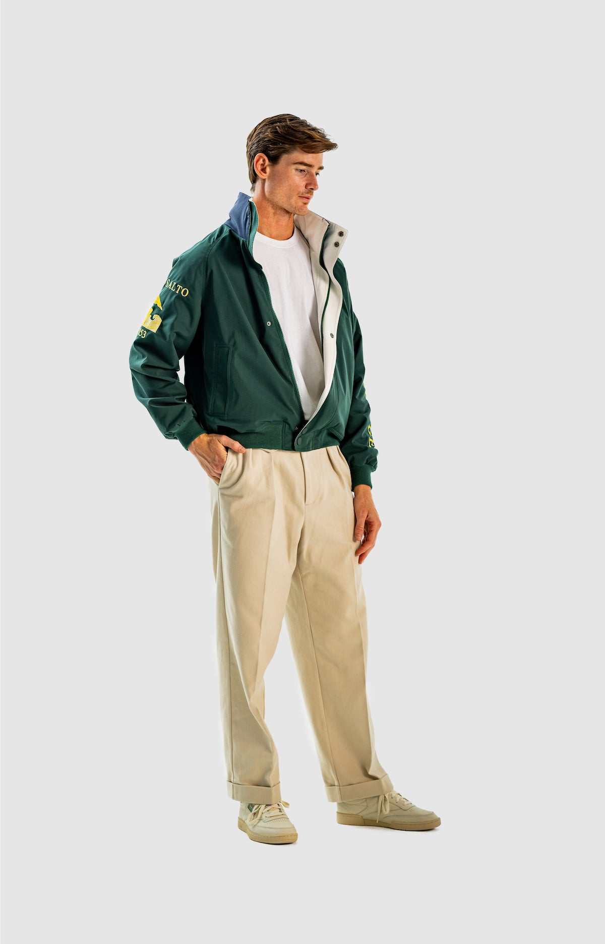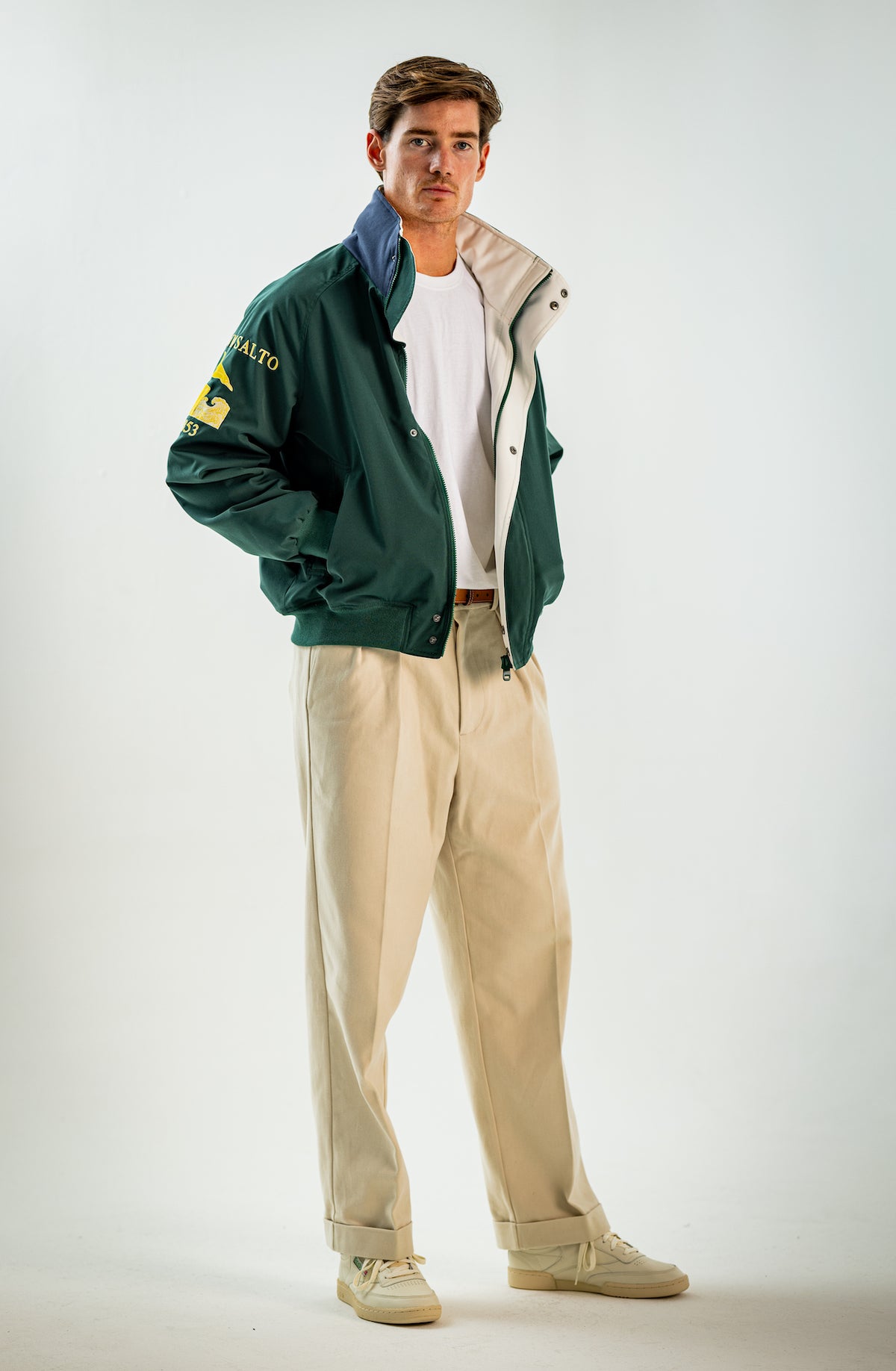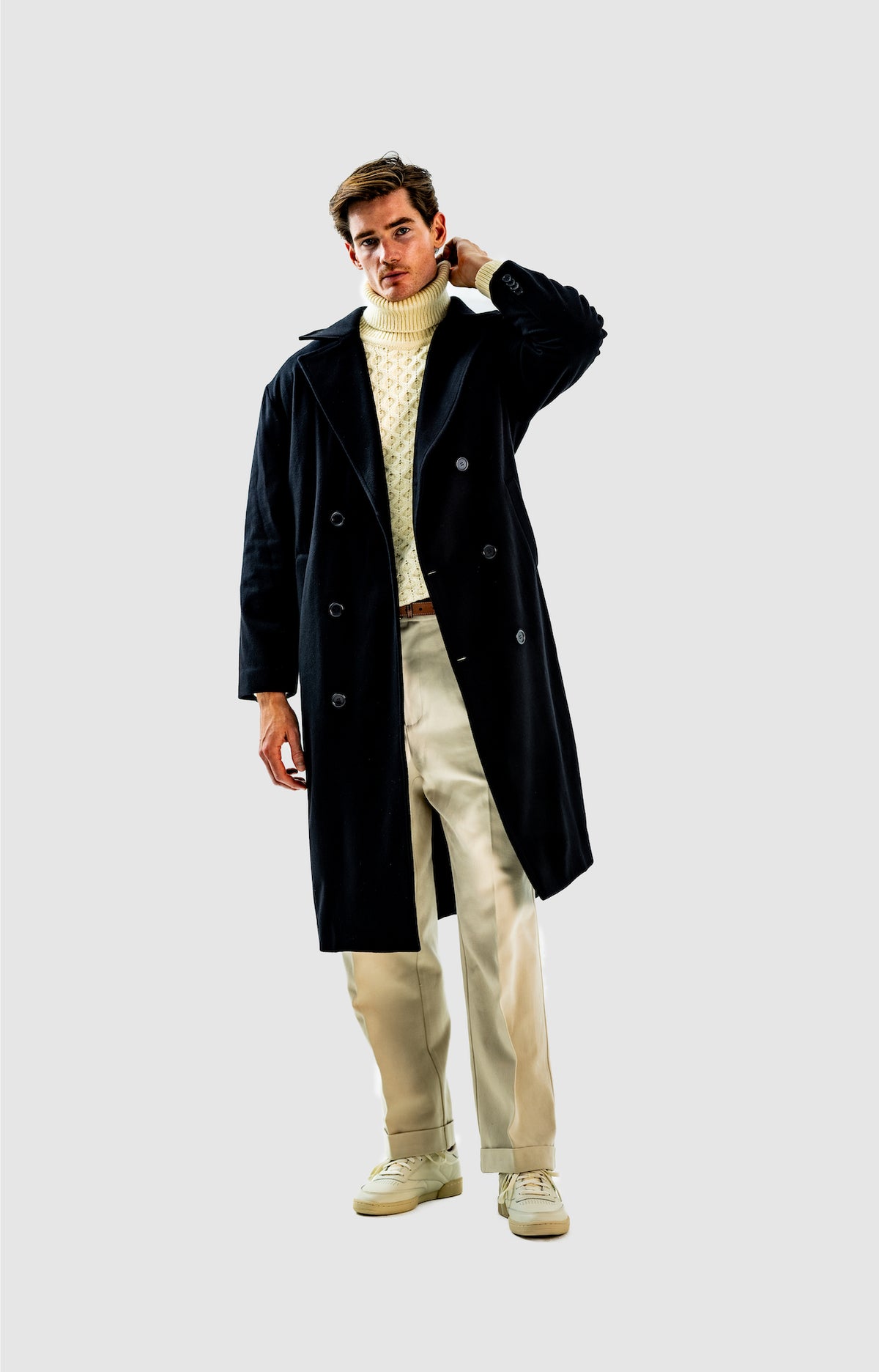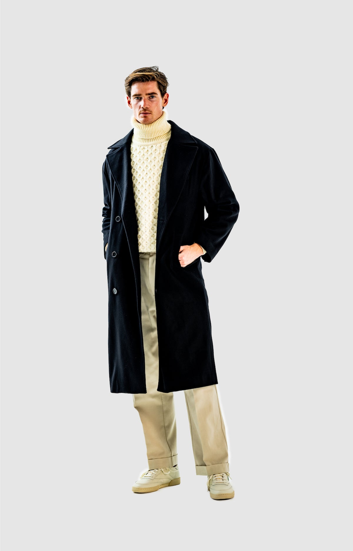 Wide and straight-legged pants only! Men have to start wearing trousers again and wear them on their waist again, and not on the hips or lower. This jacket is a fit meant to sit on your hips, just on or over your trousers' waist. A good leather and/or simple belt really helps frame the outfit and division between top and bottom. I highly recommend a pair of straight light blue or navy jeans, straight or wide chinos in cream, navy or even black, and of course, our own pleated trousers too. Either cropped or full-length trousers work here.