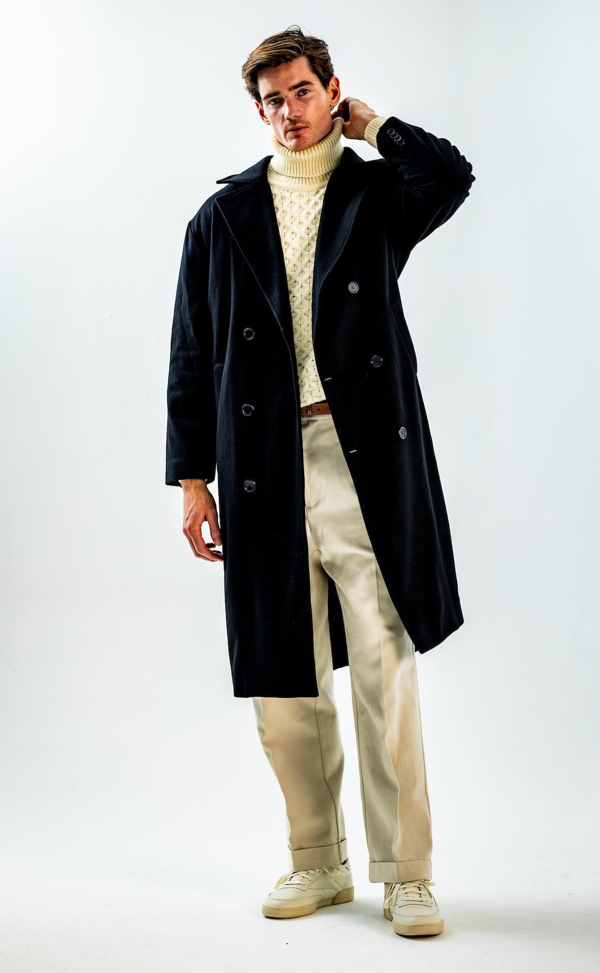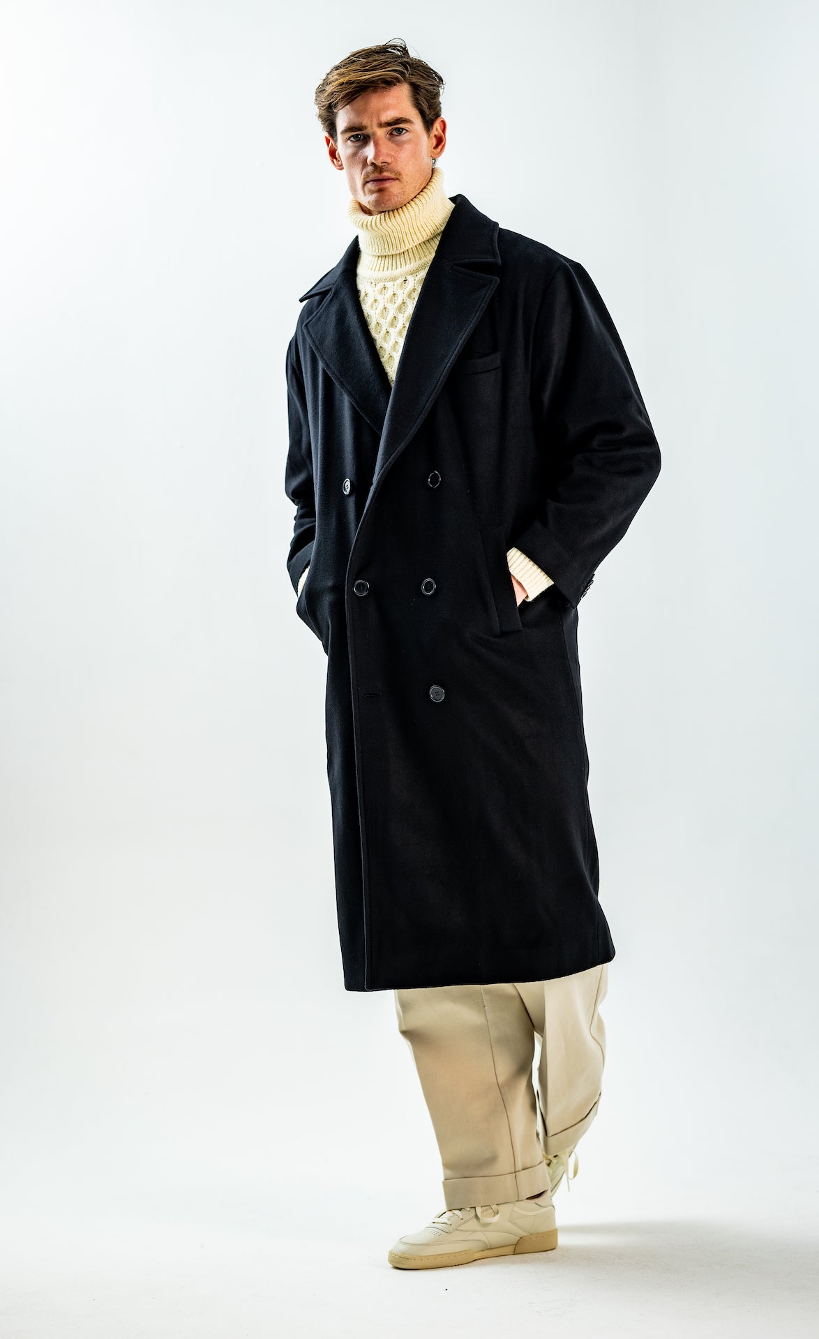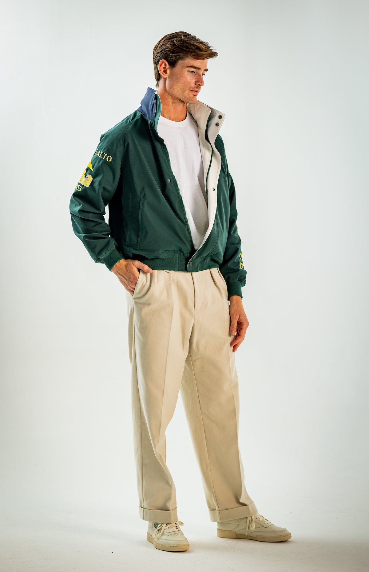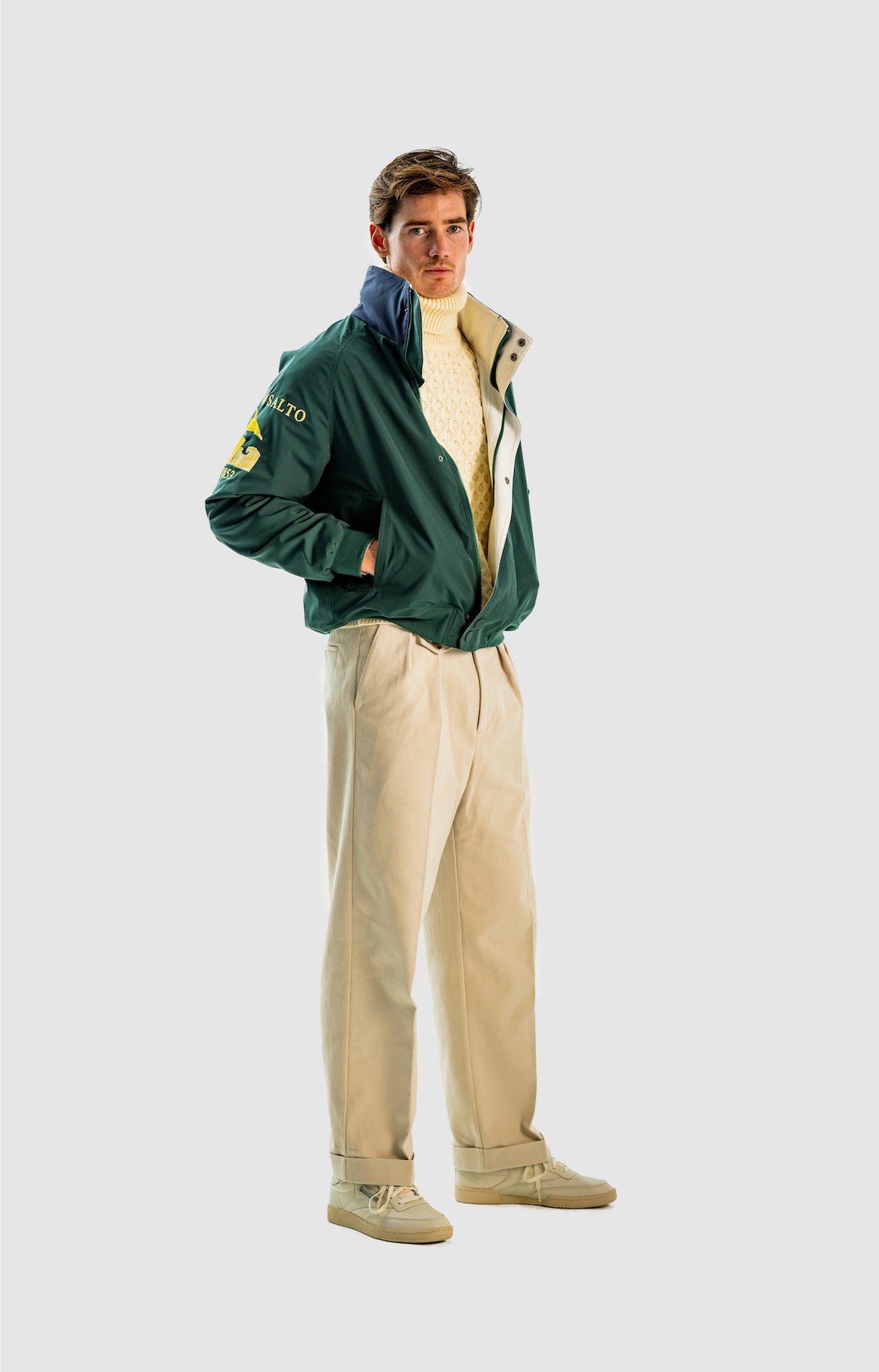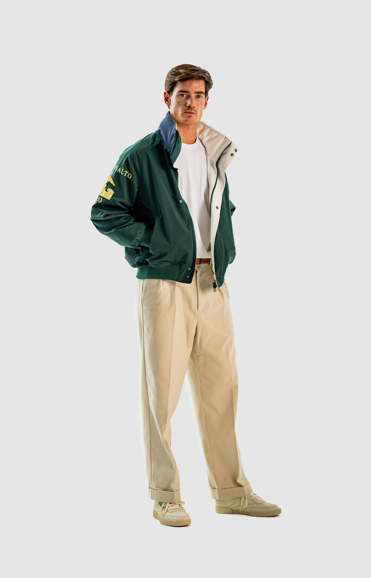 Wide and straight-legged pants only! Men have to start wearing trousers again and wear them on their waist again, and not on the hips or lower. This jacket is a fit meant to sit on your hips, just on or over your trousers' waist. A good leather and/or simple belt really helps frame the outfit and division between top and bottom. I highly recommend a pair of straight light blue or navy jeans, straight or wide chinos in cream, navy or even black, and of course, our own pleated trousers too. Either cropped or full-length trousers work here.