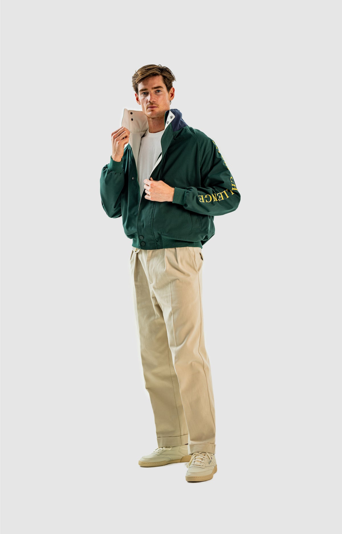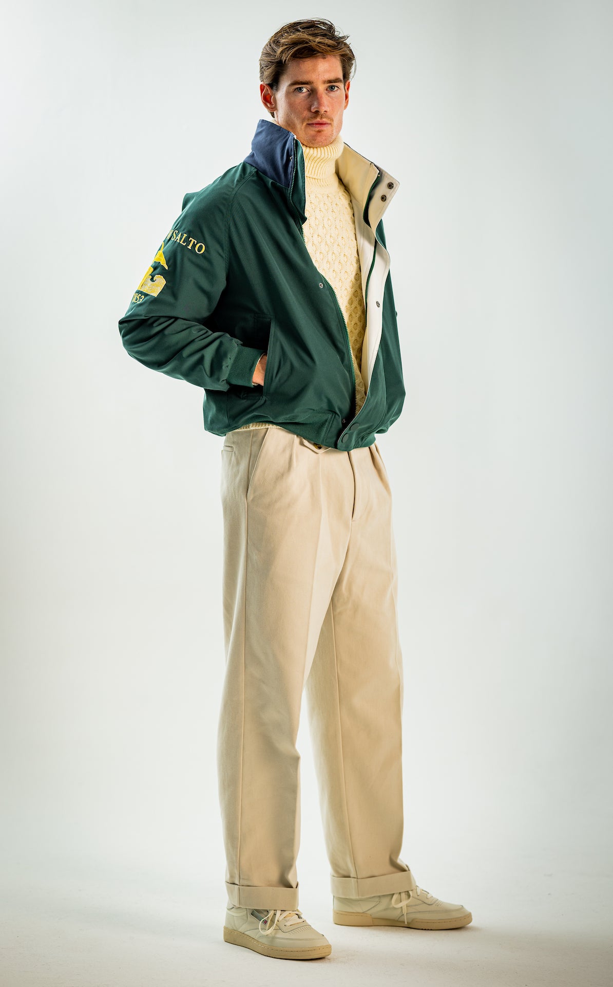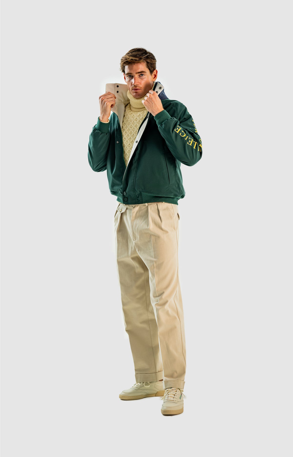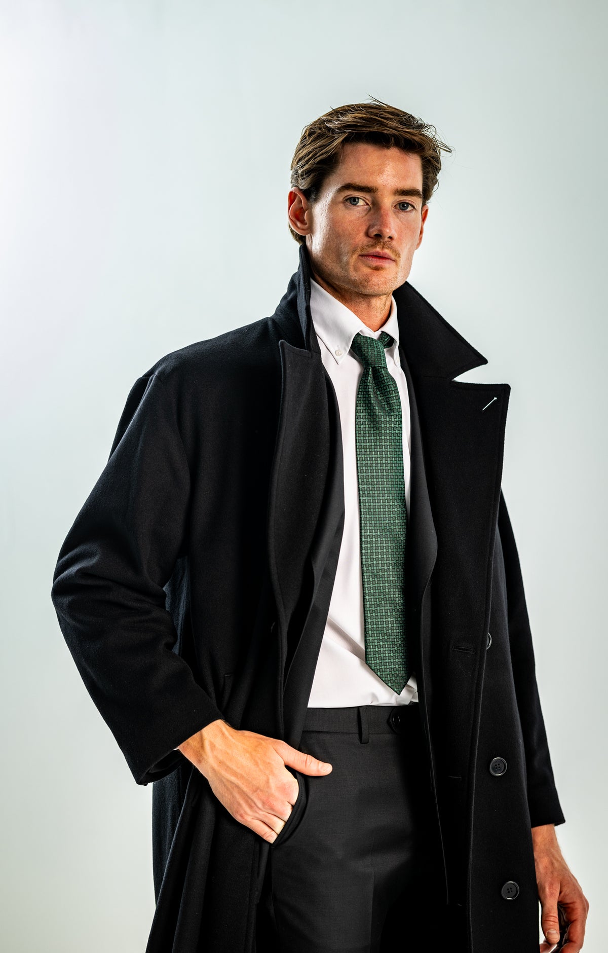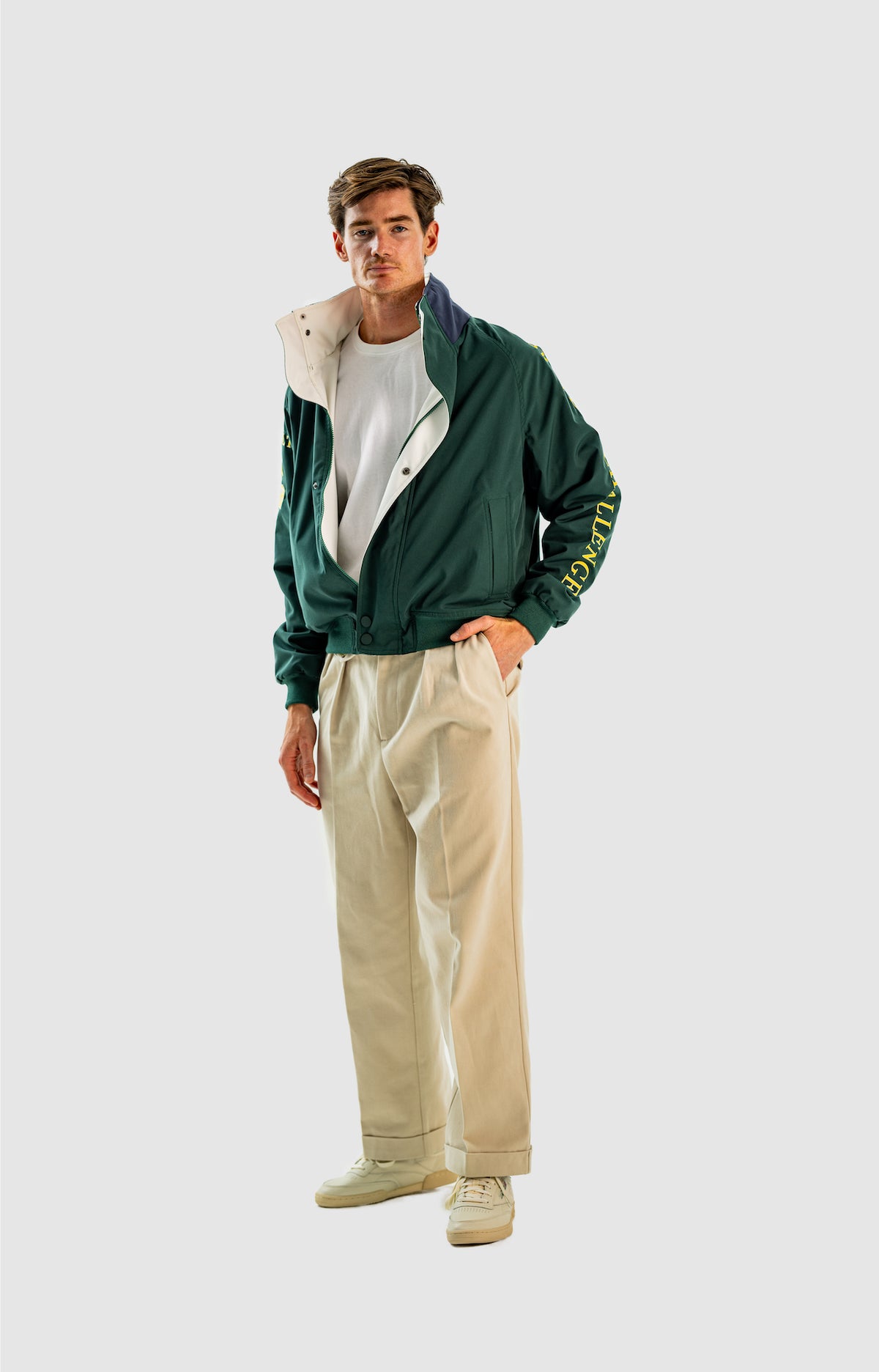 Wide and straight-legged pants only! Men have to start wearing trousers again and wear them on their waist again, and not on the hips or lower. This jacket is a fit meant to sit on your hips, just on or over your trousers' waist. A good leather and/or simple belt really helps frame the outfit and division between top and bottom. I highly recommend a pair of straight light blue or navy jeans, straight or wide chinos in cream, navy or even black, and of course, our own pleated trousers too. Either cropped or full-length trousers work here.