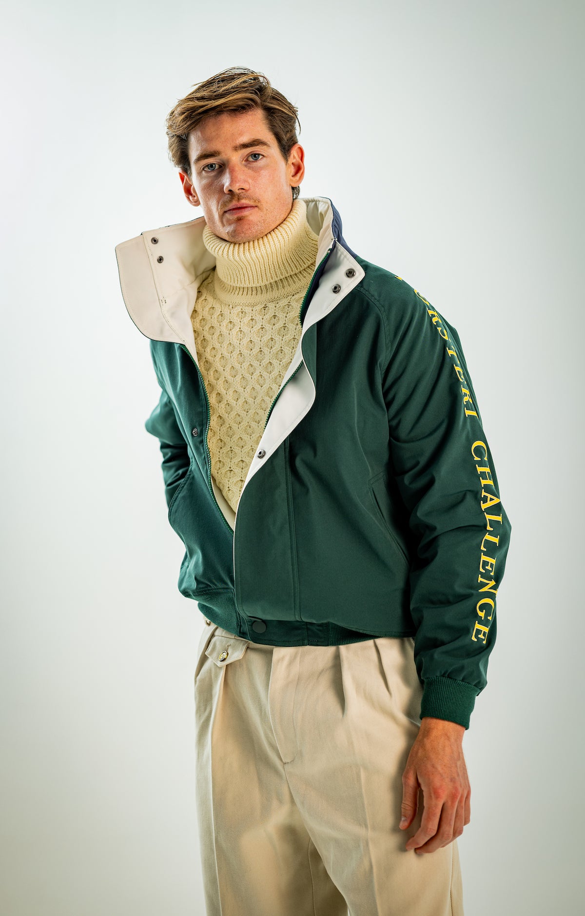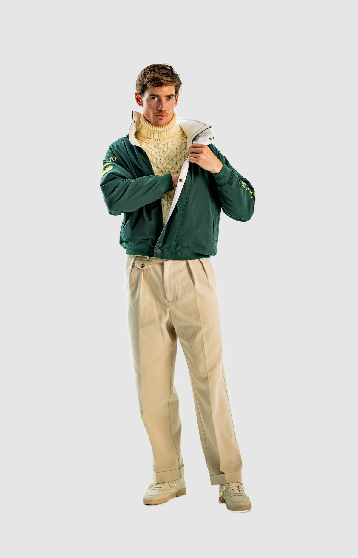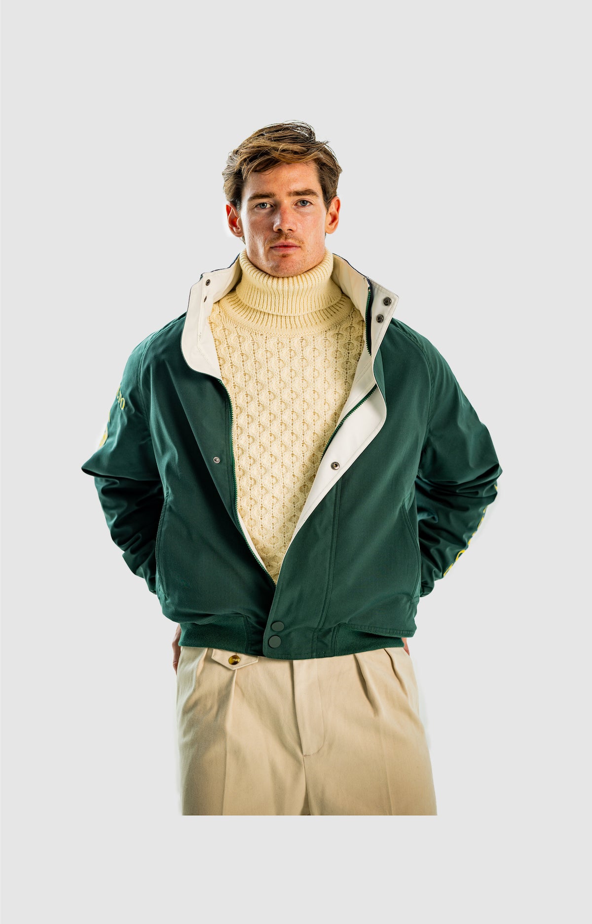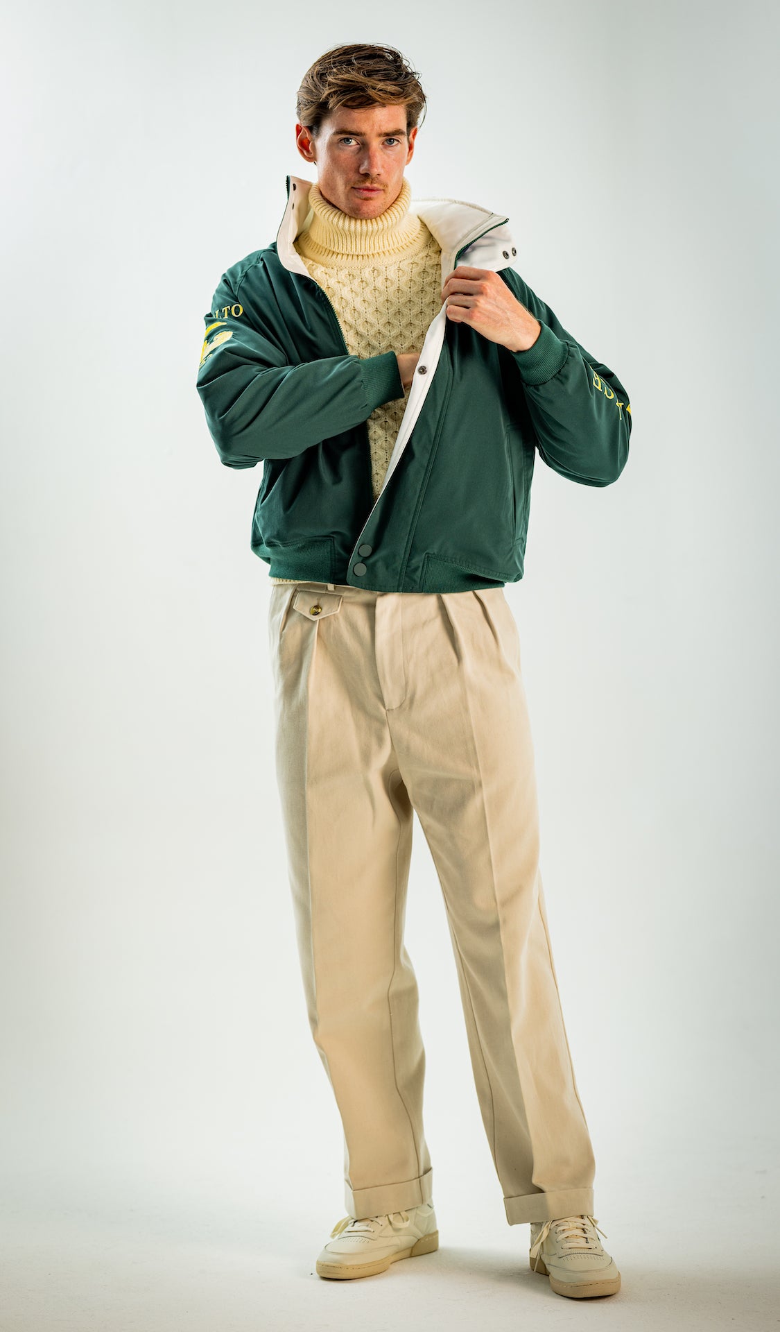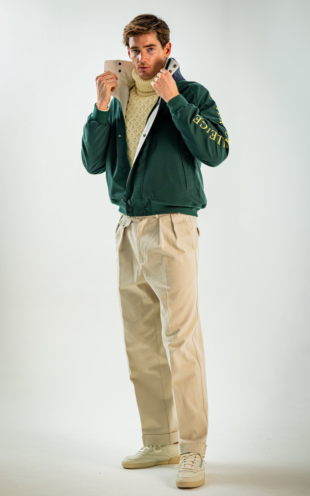 Wide and straight-legged pants only! Men have to start wearing trousers again and wear them on their waist again, and not on the hips or lower. This jacket is a fit meant to sit on your hips, just on or over your trousers' waist. A good leather and/or simple belt really helps frame the outfit and division between top and bottom. I highly recommend a pair of straight light blue or navy jeans, straight or wide chinos in cream, navy or even black, and of course, our own pleated trousers too. Either cropped or full-length trousers work here.