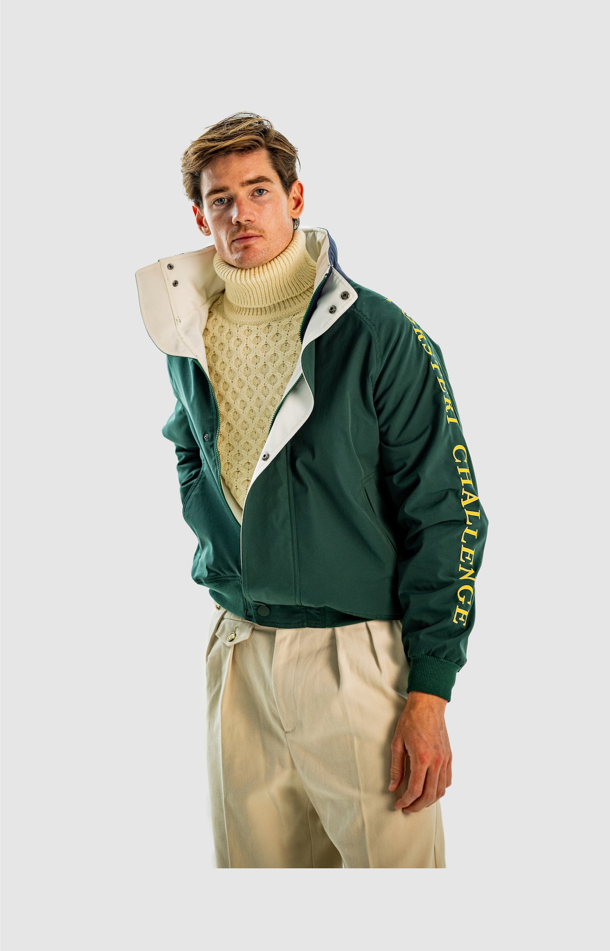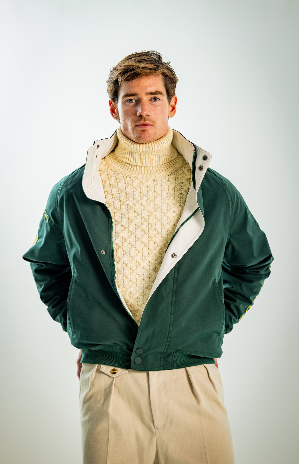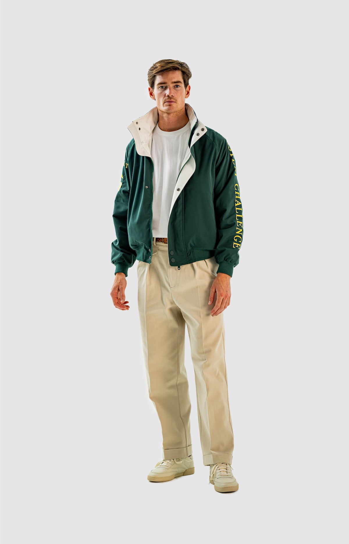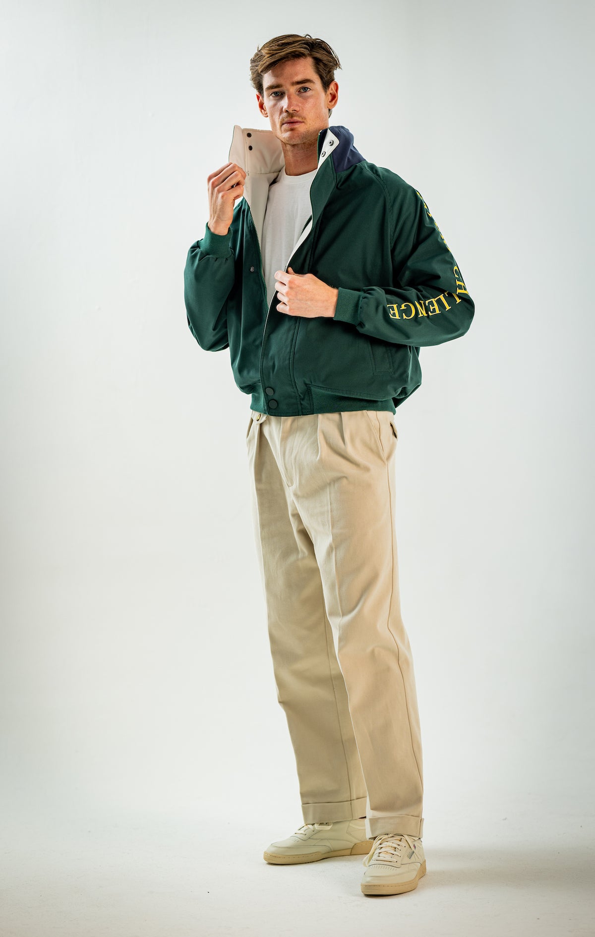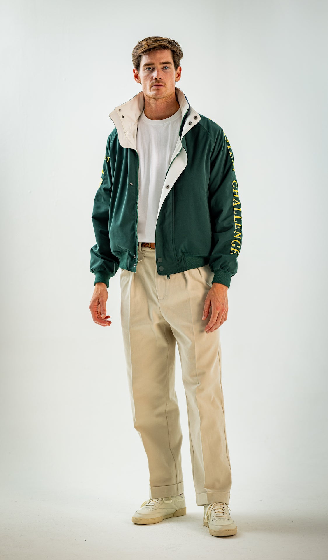 Wide and straight-legged pants only! Men have to start wearing trousers again and wear them on their waist again, and not on the hips or lower. This jacket is a fit meant to sit on your hips, just on or over your trousers' waist. A good leather and/or simple belt really helps frame the outfit and division between top and bottom. I highly recommend a pair of straight light blue or navy jeans, straight or wide chinos in cream, navy or even black, and of course, our own pleated trousers too. Either cropped or full-length trousers work here.