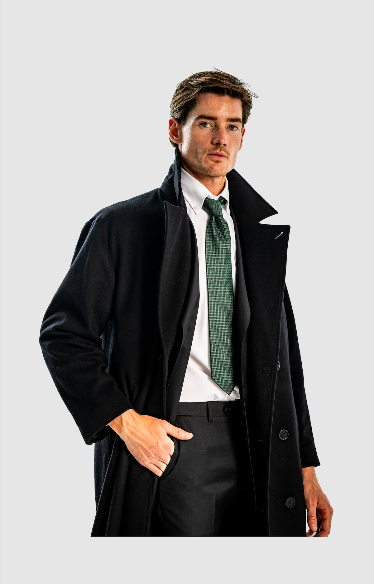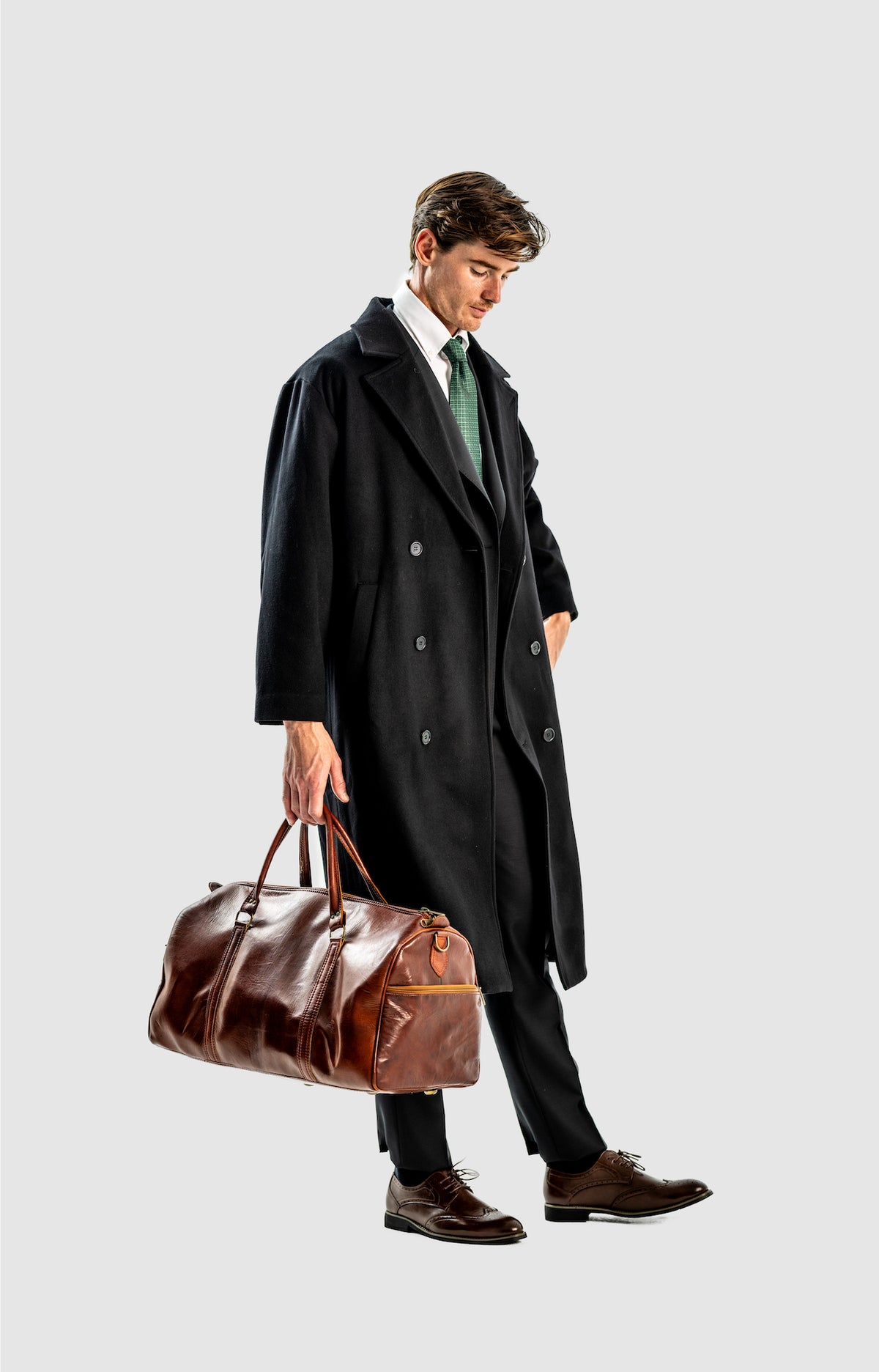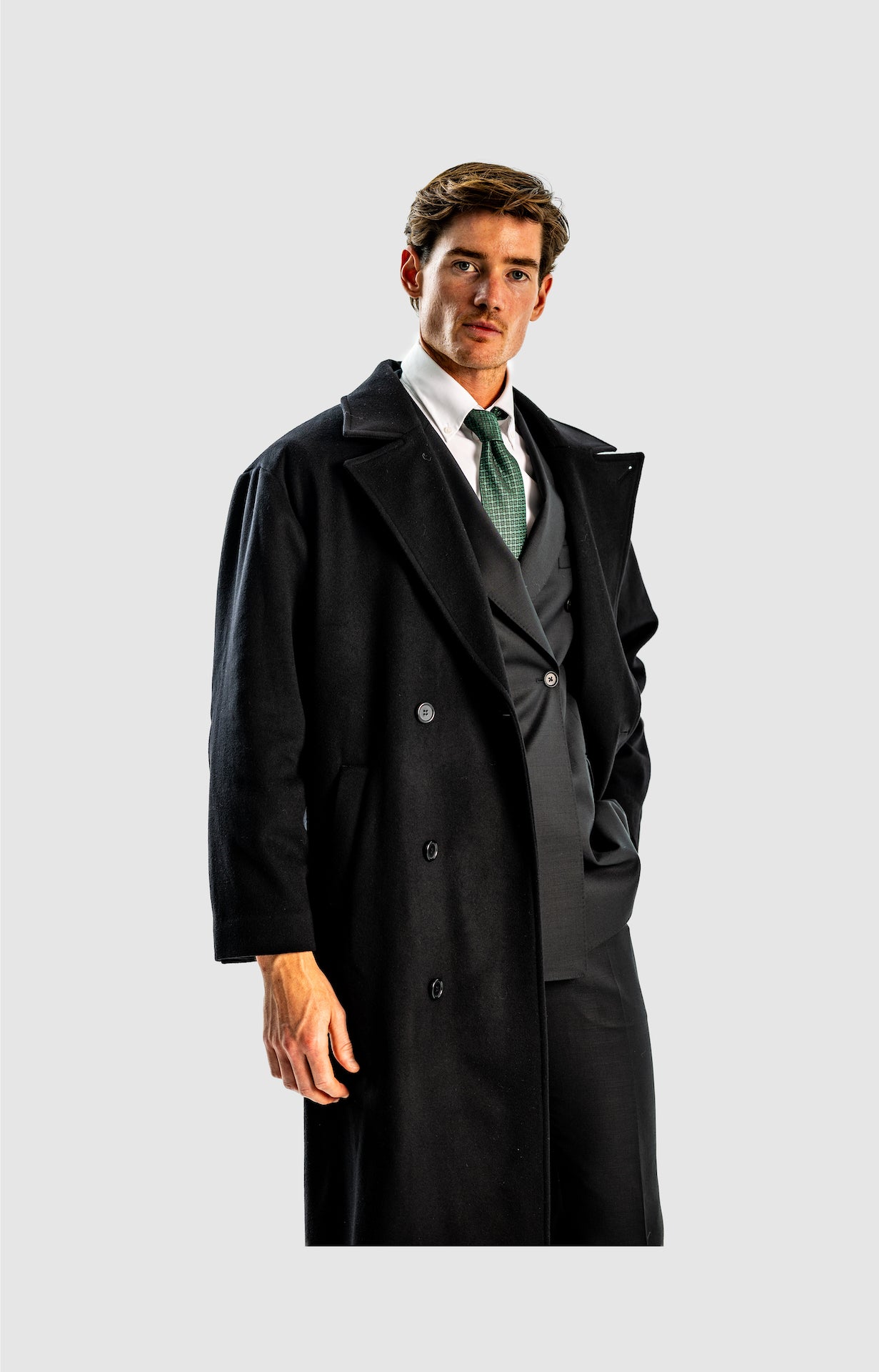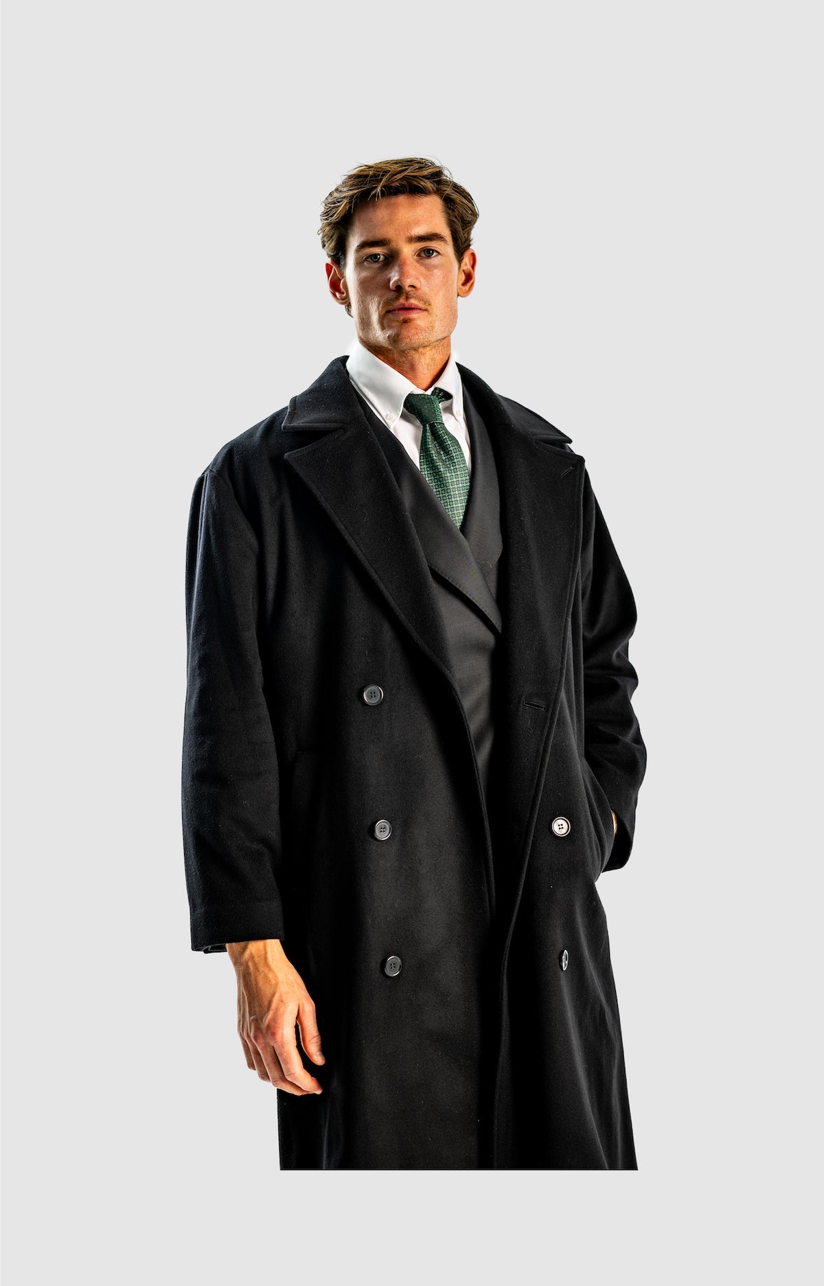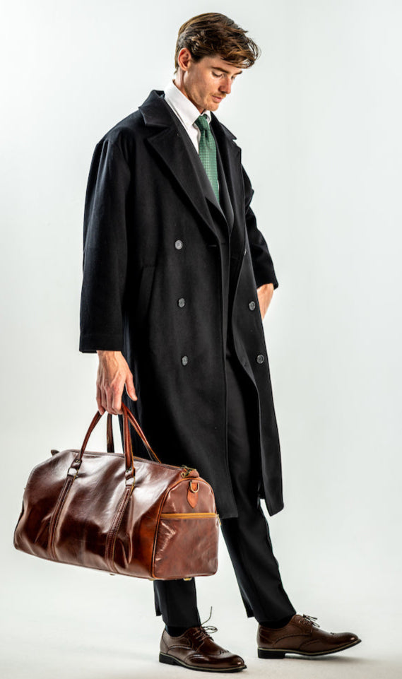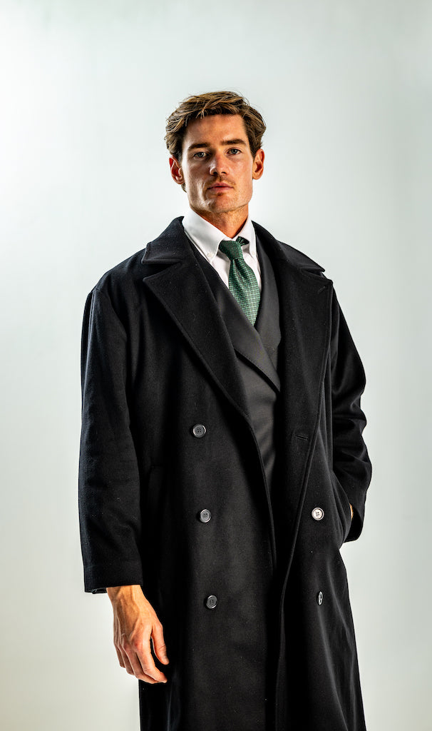 This is quite straightforward, as most men will know, you should wear a good-fitting 2 or 3-piece suit underneath by of course, making sure you have straight or wide-legged, preferably pleated trousers to accompany and some office shoes. Ideal colour would be black, grey and dark grey, dark brown, even cream or white for those who enjoy those colour suits.