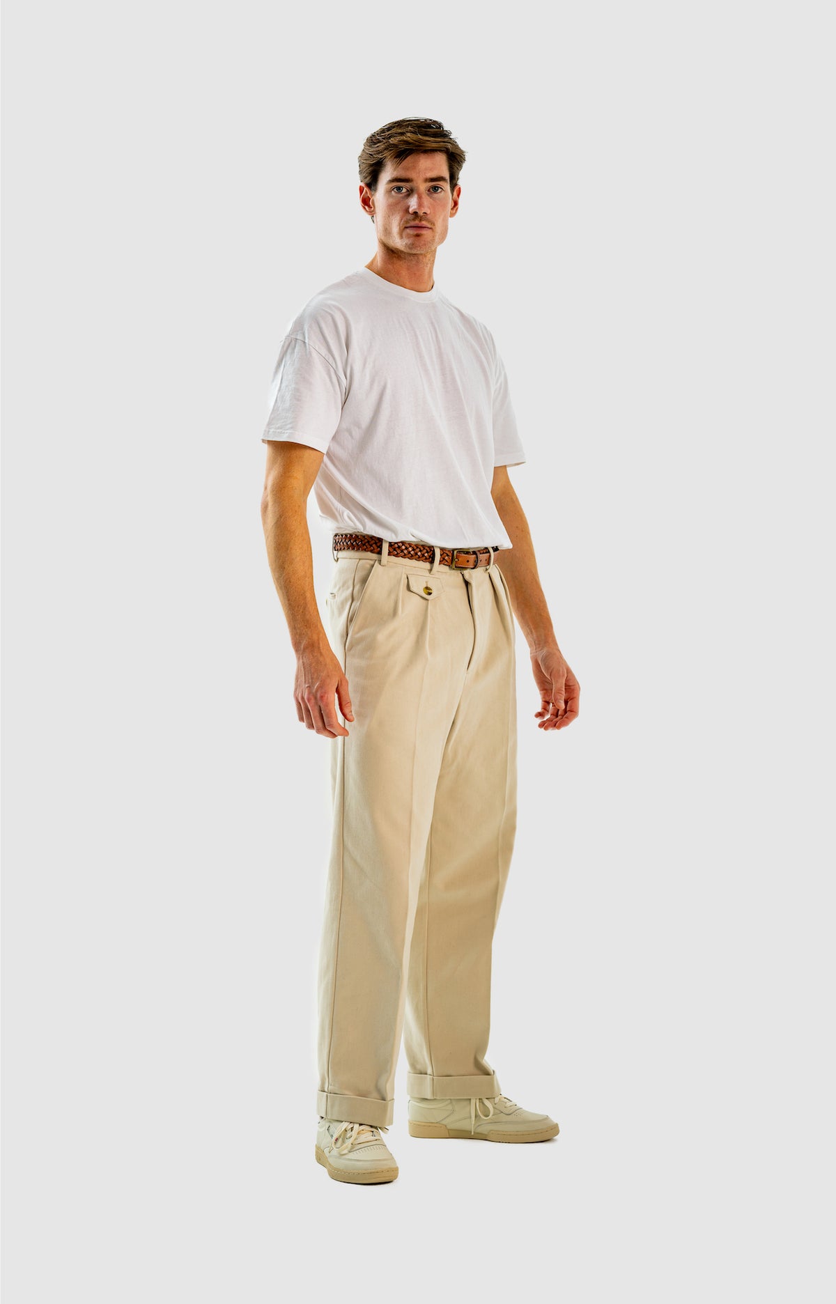 Pleated, long and wide-legged, so create some volume on top as well. These are thick but extremely soft pants and will wear them in time. A good leather and/or classic belt helps frame these as well - don't worry about belt folding marks, as the pair has 7 reinforced belt loops