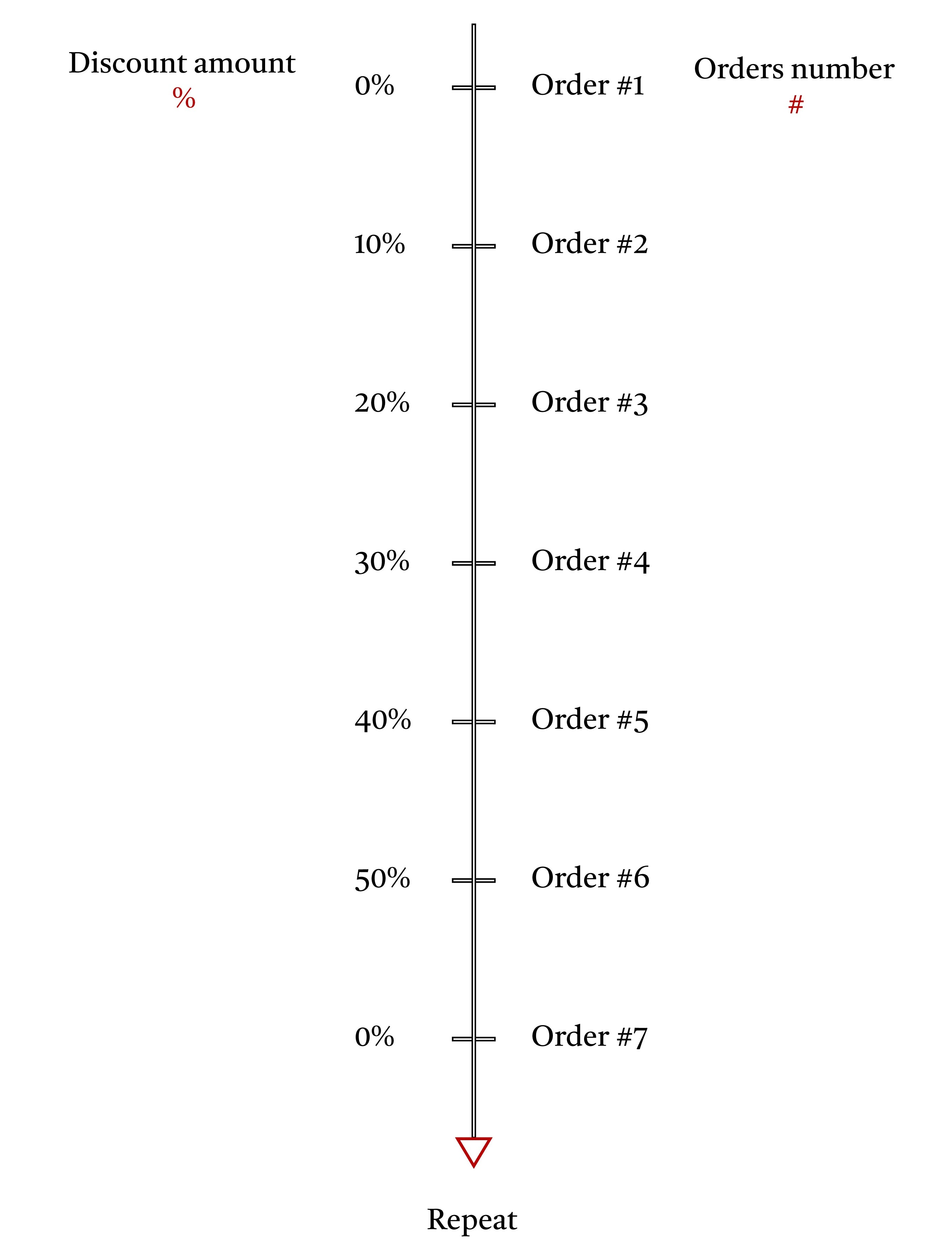 Each purchase grants you an accumulative discount code up to 50% (6 purchases total), which can be redeemed once each